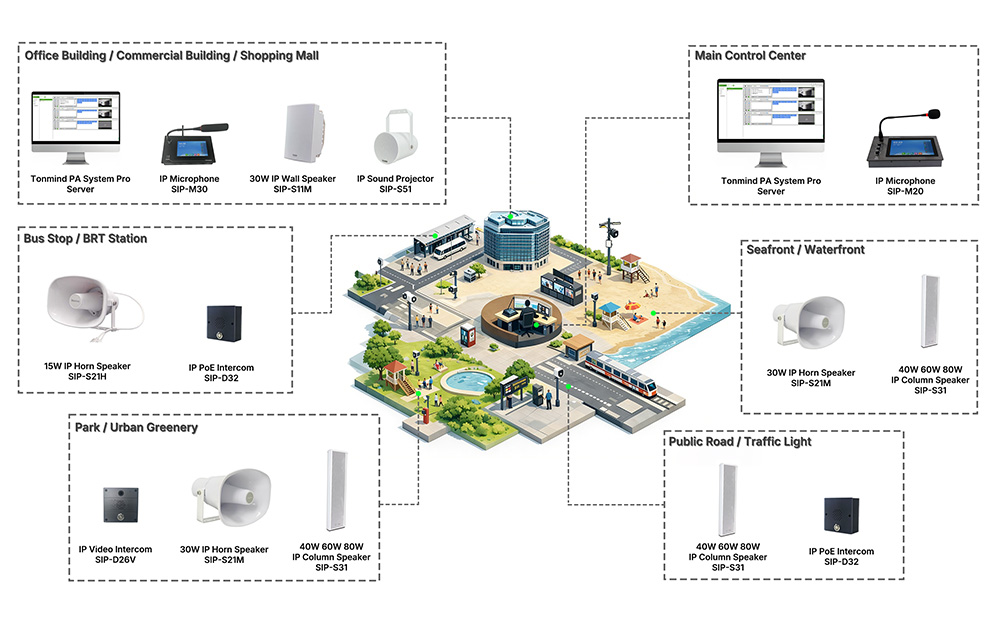 The TONMIND Public Area Solution blends modern network-based PA system capabilities with industry-standard protocols like SIP and ONVIF. By using IP Speakers and open integrations, cities and public venues can communicate more effectively, enhance safety, and deliver a richer visitor experience. This solution is not just audio hardware — it’s a cornerstone of connected, responsive urban environments.