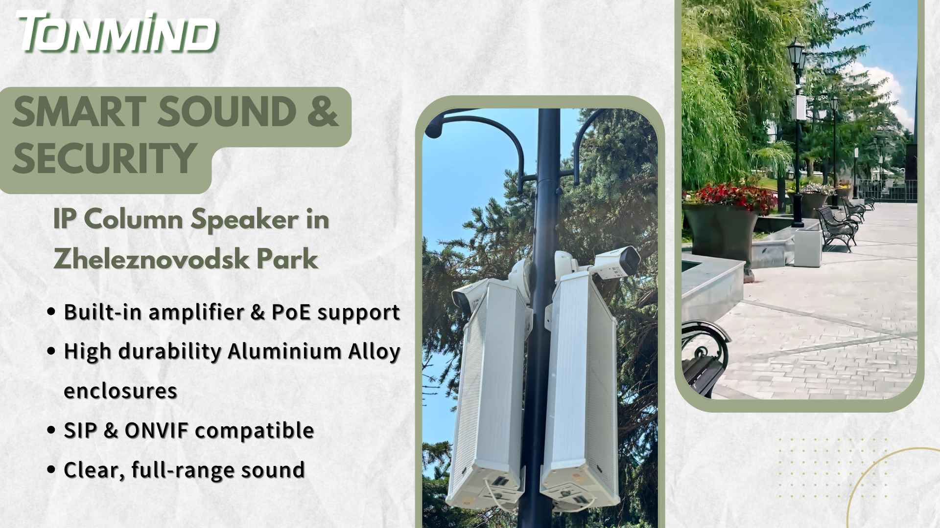 Os visitantes desfrutam de uma atmosfera mais rica com música ambiente, enquanto a segurança do parque ganha uma ferramenta poderosa e integrada para uma gestão proativa da segurança – tudo isso a partir de instalações discretas em postes de iluminação. Os alto-falantes de coluna IP da Tonmind proporcionam a harmonia perfeita entre ambiente e segurança para espaços públicos modernos. Somos gratos por fazer parte deste projeto significativo e esperamos que a solução da Tonmind possa continuar agregando valor a espaços públicos como este.