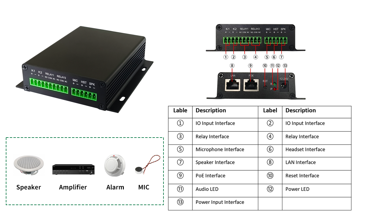 O Tonmind SIP-T21 é um adaptador de paginação SIP compacto e potente, projetado para integração perfeita com sistemas VoIP. Ele suporta comunicação de intercomunicação bidirecional, codec de áudio 48K OPUS de alta qualidade e é compatível com os protocolos SIP e ONVIF. Equipado com um amplificador integrado de 15 W, permite conexão direta a alto-falantes e microfones. O dispositivo suporta mensagens pré-gravadas (WAV/MP3), vários acionadores de alarme (GPIO, URL HTTP, saída de relé) e oferece opções de energia flexíveis via PoE ou CC 12 V/24 V. Com portas LAN duplas e interfaces de E/S abrangentes, o SIP-T21 é ideal para atualizar sistemas de paginação analógicos para redes baseadas em IP . É perfeito para ser aplicado em vários sistemas de PA, por exemplo, escolas, varejo, centros comerciais, etc.